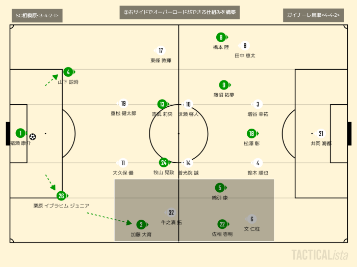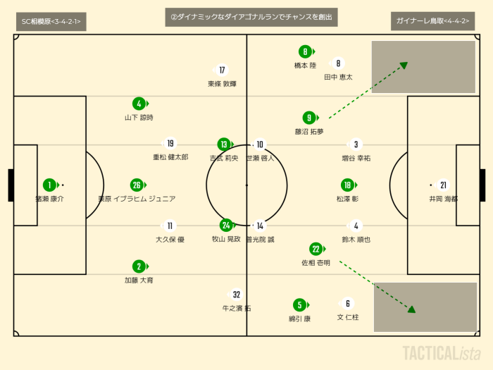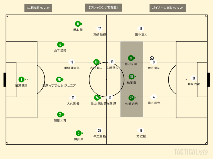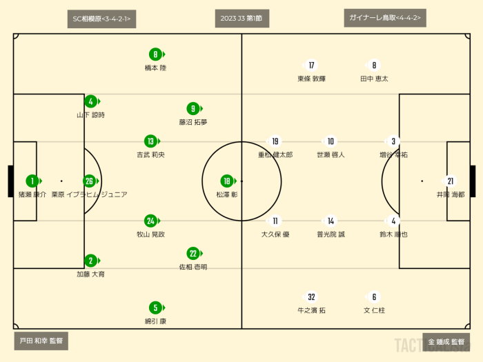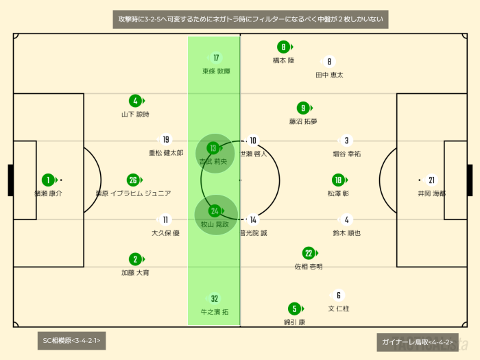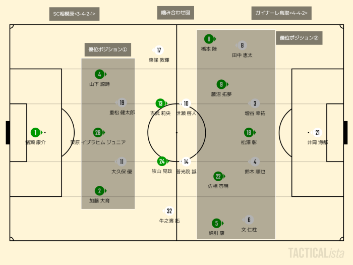 オーソドックスな4-4-2のガイナーレ鳥取に対して“4-4-2殺し”として4-4-2への相性抜群の3-4-2-1で挑むSC相模原。フィールドプレーヤーの8割が優位とそのかみ合わせ相性は上記「噛み合わせ図」を見れば一目瞭然だ。