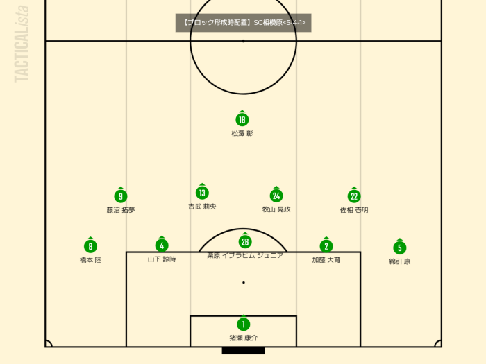 SC相模原はリトリートした際には【5-4-1】のローブロックを形成し、5レーンすべてに人を配置して自陣ゴール前のスペースを消す。しかし、1点目、2点目の失点シーンなどで見られた通り、26番のDF経験の浅い栗原 イブラヒム ジュニアの1V1の対応の悪さが特に目立ってしまい、最後の個の局面で打開されてしまう形となった。