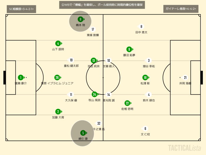 SC相模原は攻撃時に両WBがライン際に立つことでチームに幅をもたらす。特に後方からのビルドアップ時のプレス回避先、縦パスが封じられた時に効果を発揮し、このエリアでボールを受けることでチームに立ち位置を修正する時間を提供することに成功していた。