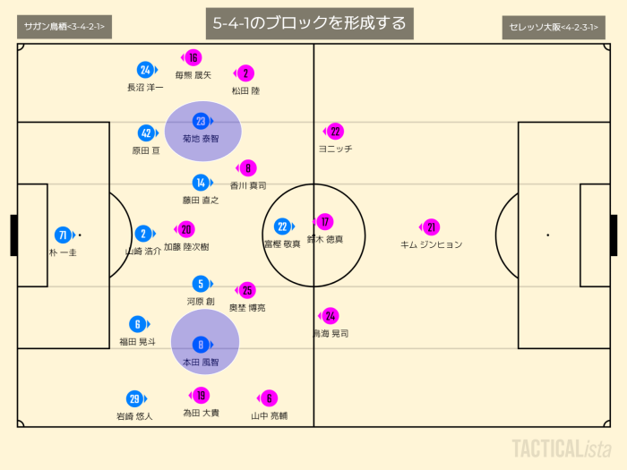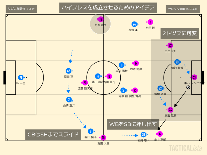 サガン鳥栖がセレッソ大阪に対してハイプレスをかける際には次のような配置となる。