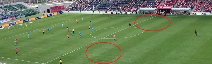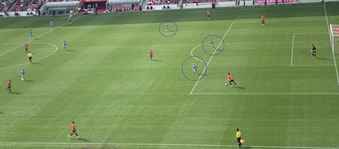 図の通りに前線の3枚でセレッソ大阪の6人を担当する形になる。3枚ともに激しいプレッシングを仕掛けていたが、容易に剥がされてしまい無駄にエネルギーを浪費していたと言わざるを得ない。