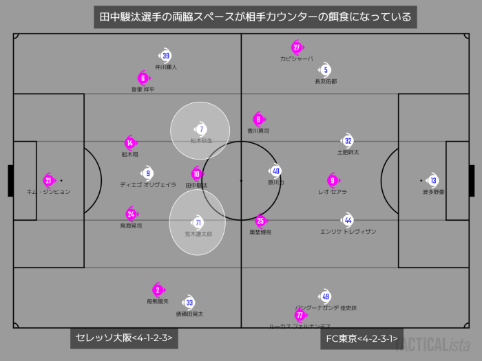 開幕戦ではネガトラ時に防波堤がなく、カウンターを受けることが多かった。その原因となっていたのが田中駿汰選手の両脇のスペースだ。このスペースはFC東京の松木選手や荒木選手に幾度となく制圧され、大きなピンチを招いていた。