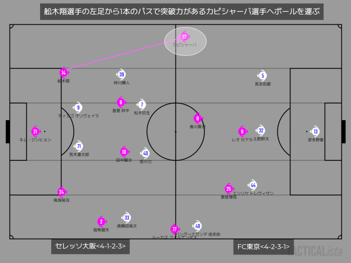 また、登り里選手がIHに位置することで、舩木翔選手の左足から1本のパスで突破力があるカピシャーバ選手へボールを運ぶことができるようにデザインされていた。