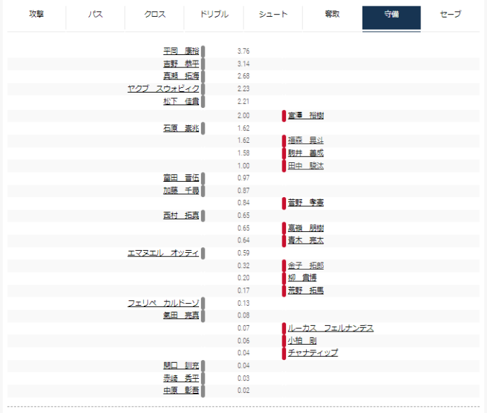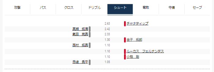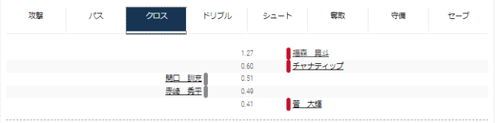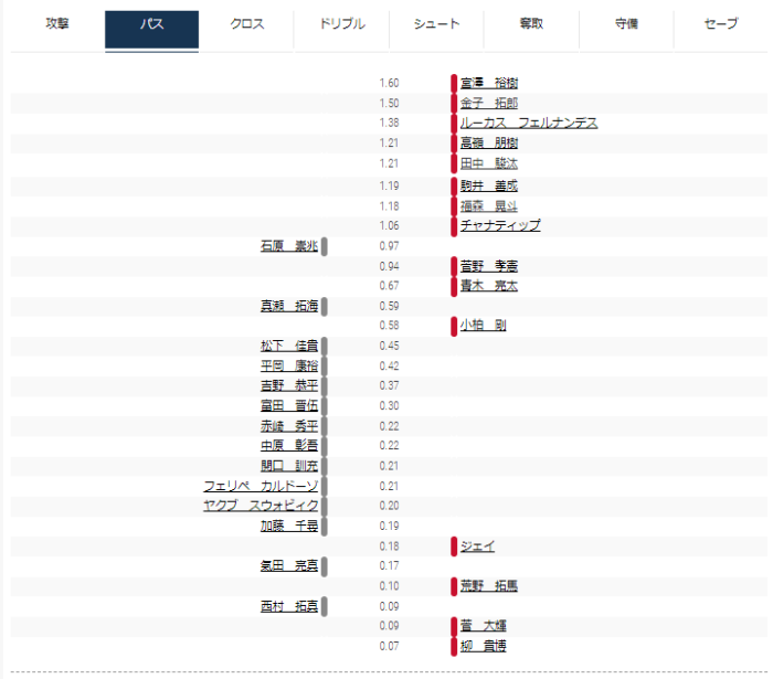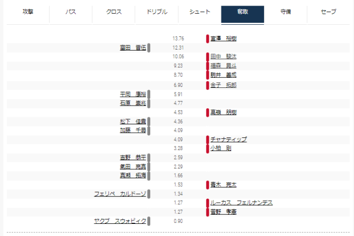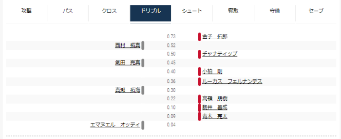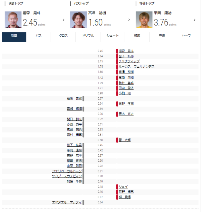 攻撃トップは福森、パストップは宮澤、守備トップは平岡だった。ドリブル、シュートは同等程度だった。
