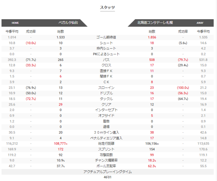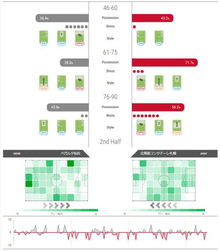 前後半どちらも、ボール保持が高いほうがシュート数が多くなっている。後半開始は仙台が多くシュートを打ててチャンスを多く作っていたが、それ以外のペースはコンサドーレのほうがよかったようだ。プレー割合では前半ゴール前にいて、アタッキングサードまででていけてない仙台は、後半はゴール前でもプレーできている。プレー割合でみるとコンサドーレのほうが優勢だったようだが、勝ちきれなかったのはもったいなかったかもしれない。