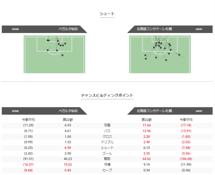 仙台はシュート数は多くないがペナルティエリアからのシュートが多く、特に右よりからのシュートが多い。コンサドーレはミドルシュートが6本で、ペナルティエリア内のシュートも12本ほど打てている。チャンスビルディングポイントではシュートが仙台のほうが高く、奪取がどちらも今季平均よりも低くなっている。