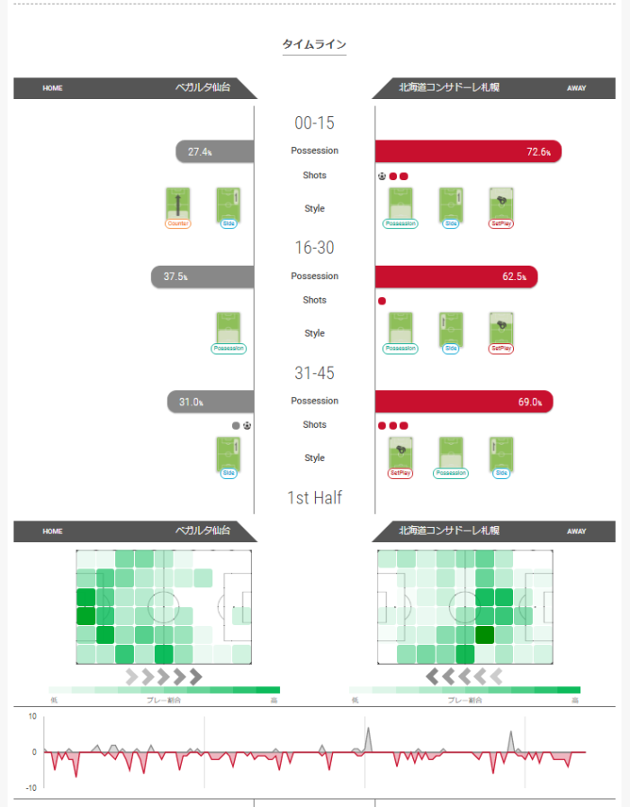 この試合は前半4分にコンサドーレの先制点、前半31分に仙台の先制点だったが、どちらも前節までと比べるとあまりなかった時間帯に得点をとったようだ。