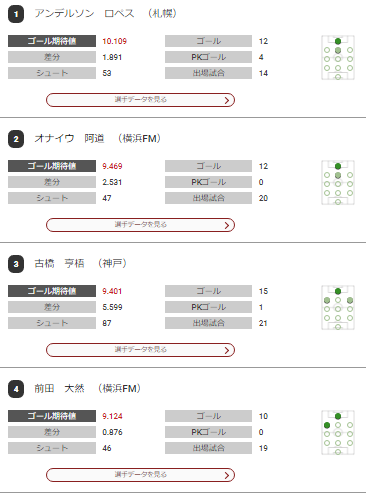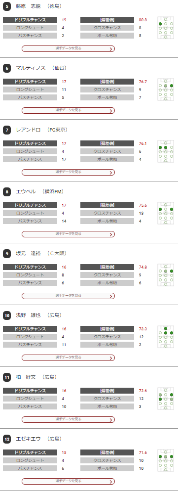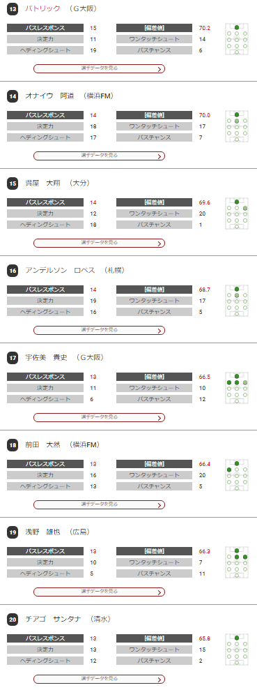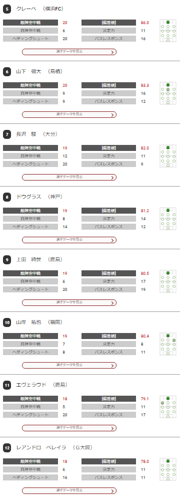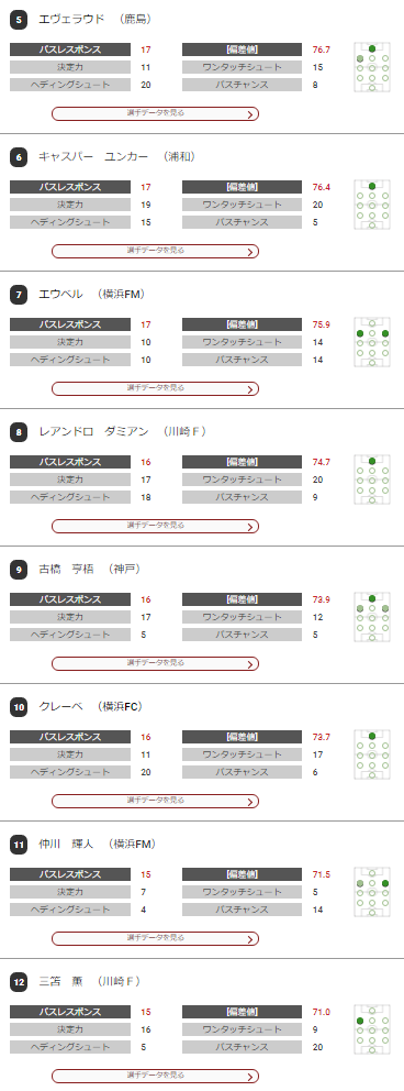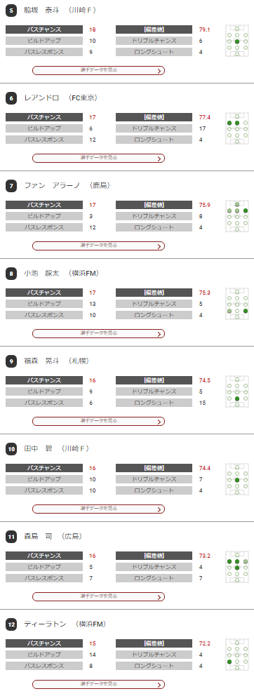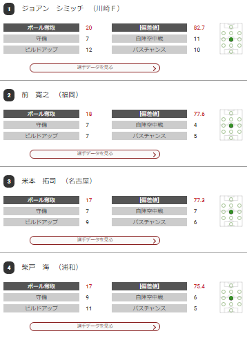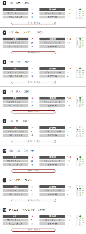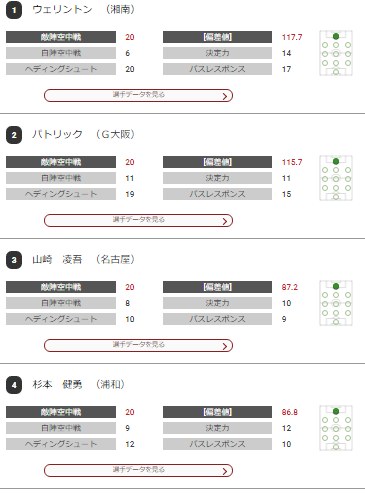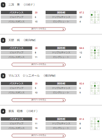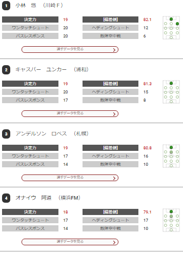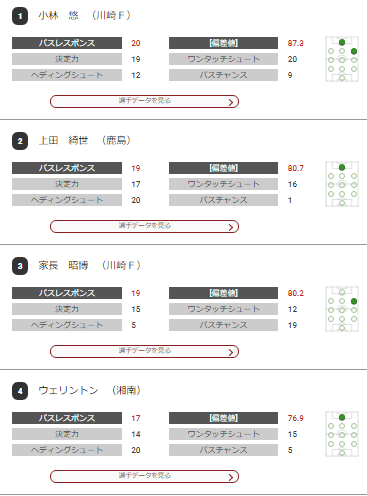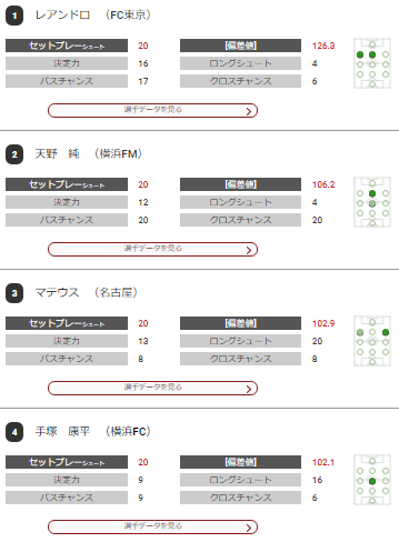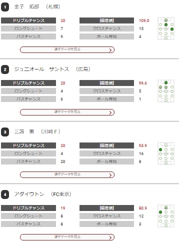 プレースタイルでは、プレー時間は多くないが、決定力ではフロンターレの小林悠がトップであり、パスレスポンス力でもトップだった。