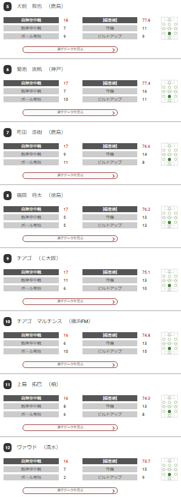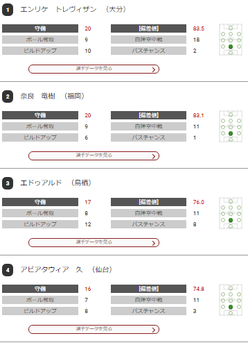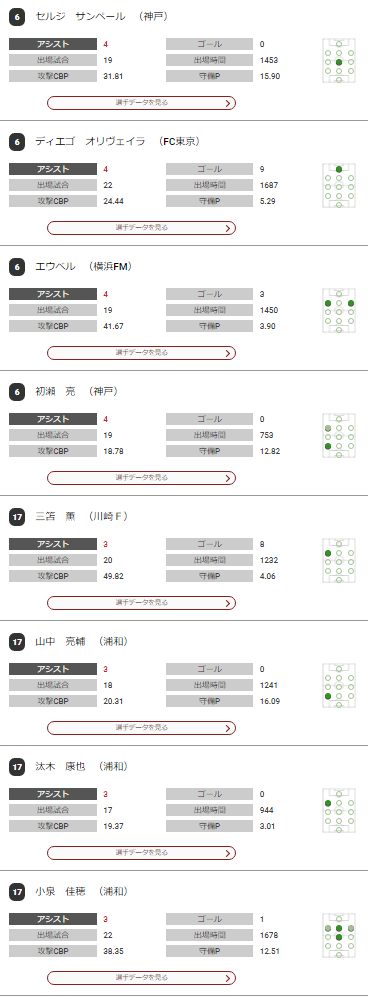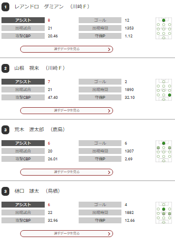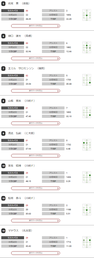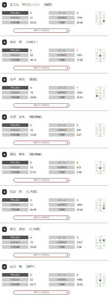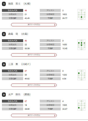 選手データでは、センターバックCBでアシストトップのコンサドーレの福森はかなり特殊に見える。