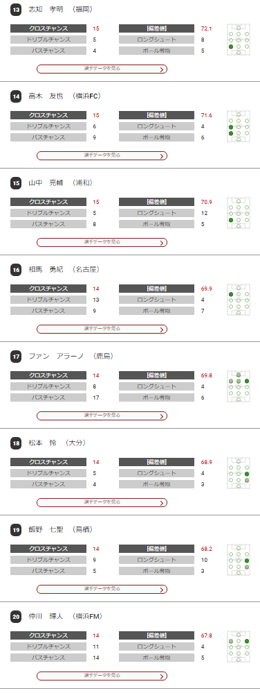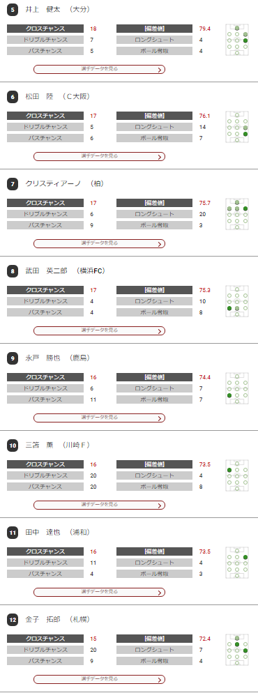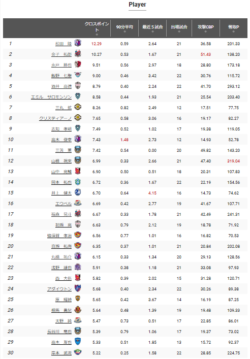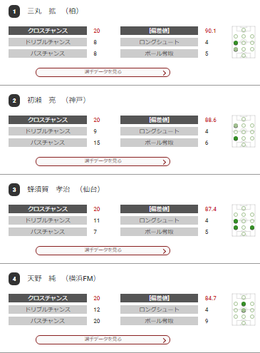 クロスCBPで2位、ドリブルCBPで1位の金子拓郎選手は凄いですね!😲