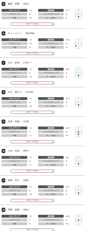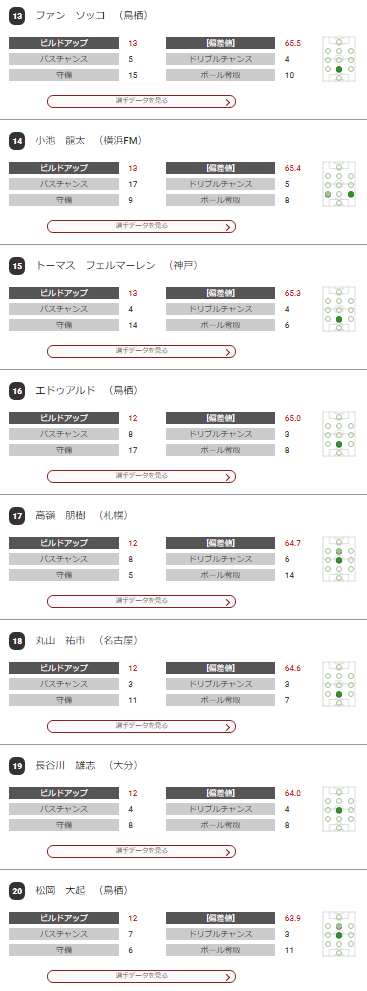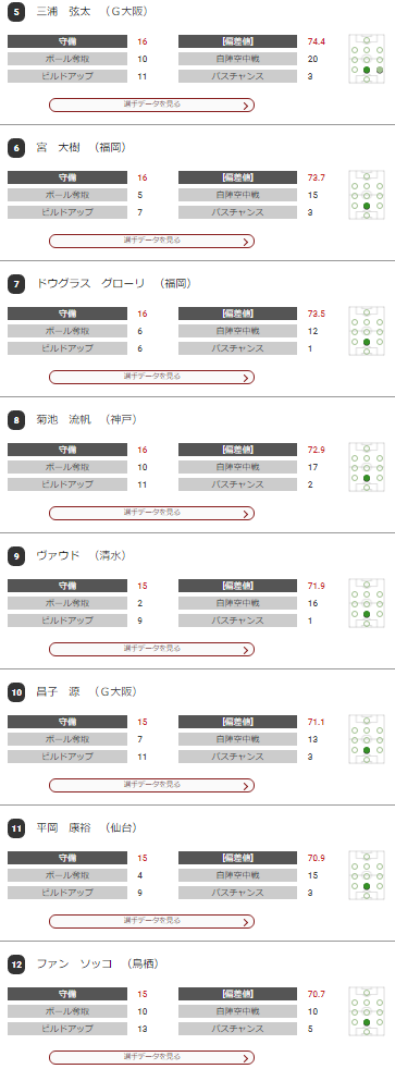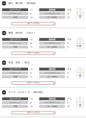「ビルドアップ力」のデータは、「パスCBP」「前方へのパス成功率」「ディフェンシブ・ミドルサードのキープ成功数」「被奪取P」などをもとに算出