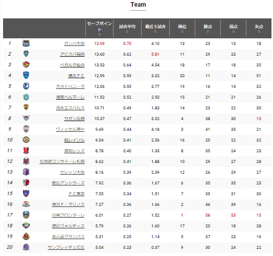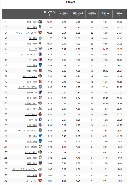 チャンスビルディングポイントCBPでは、セーブでガンバ大阪の東口がトップ。