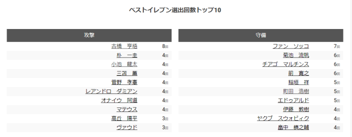 ベストイレブン選出回数トップ10 https://www.football-lab.jp/summary/best11/j1/?r=22&year=2021
