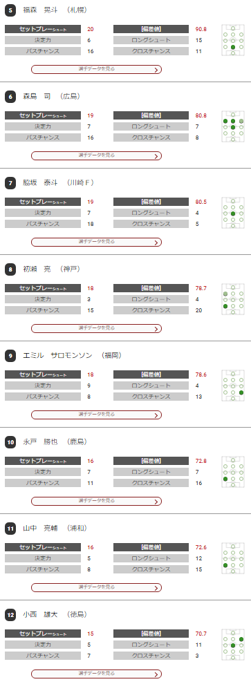 上位のチーム選手のほうがデータでも上位になりやすいと思うが、個人データでみるとそうではないこともある。またあまり注目していなかった選手が上位に来ているのも興味深い。