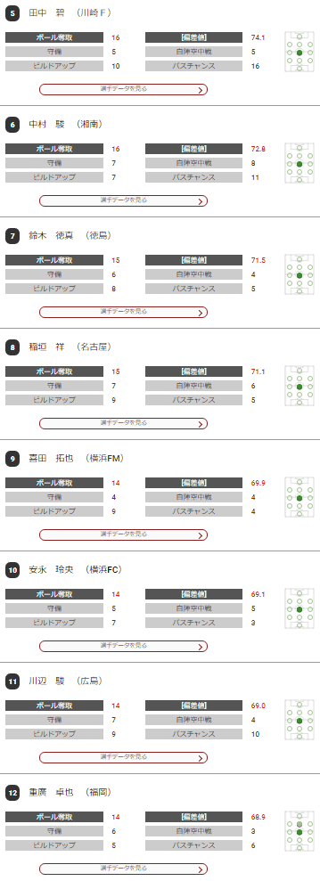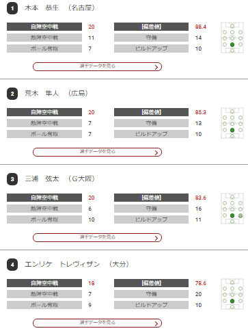選手の移籍理由は移籍先チームの補強方針や年齢などによると考えられるので、どの数値が高いから獲得されたとはいいきれないと思うが、MFの2選手は中盤の中央でパスが出せて、ボール奪取もできる選手が今回海外移籍したようだ。