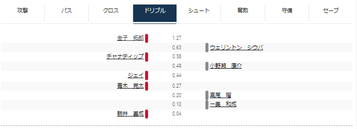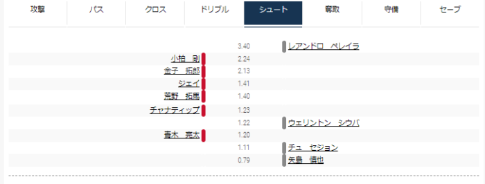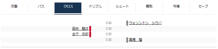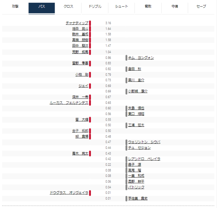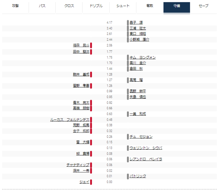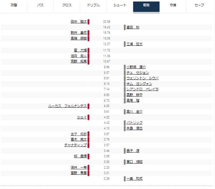 田中駿汰が攻撃、パス、クロス、奪取、守備で上位に来ており、攻守にわたりチームの要として活躍していたようだ。駒井も多くの項目で上位にきている。福森は守備でも上位だった。