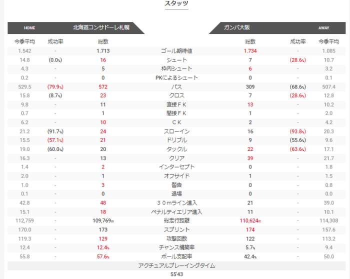 ガンバのシュート、クロス成功率が目立つ。チャンス構築率はコンサドーレが12.4%、ガンバが5.7%と大きな差がある。効率的にガンバが攻撃と得点をとっていたようだ。