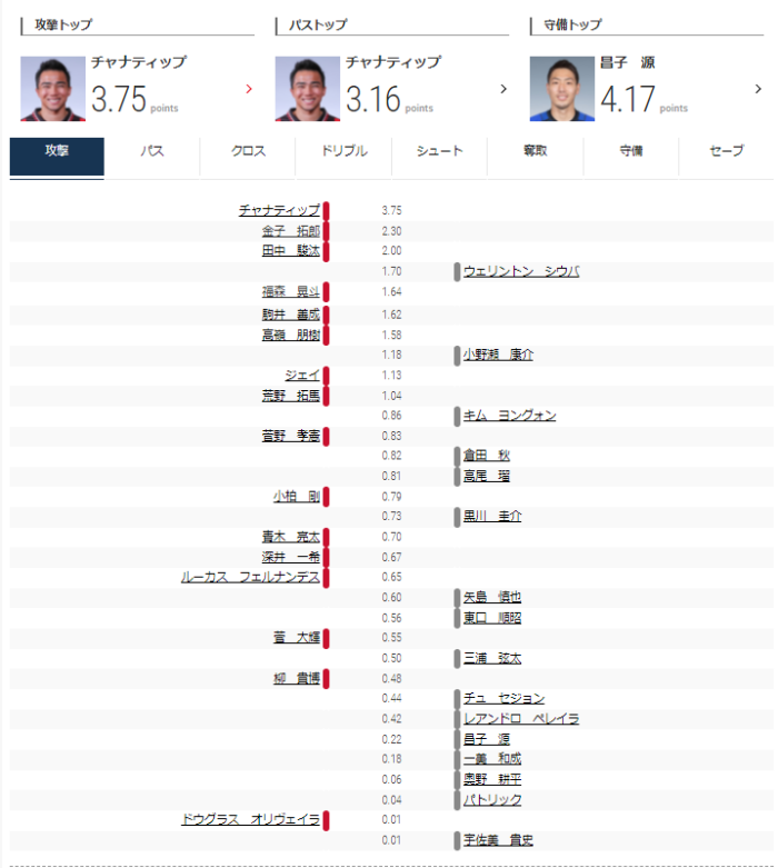 攻撃、パスのトップはチャナティップ、守備トップは昌子