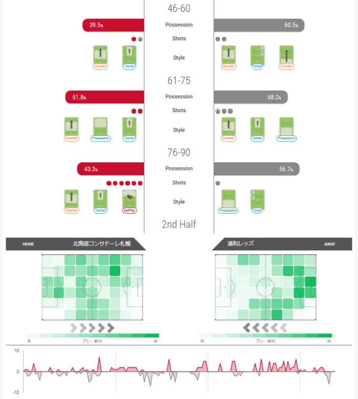 後半も45-60分で追加点をとれたコンサドーレ。浦和は左サイドのプレー割合が増えた。