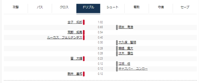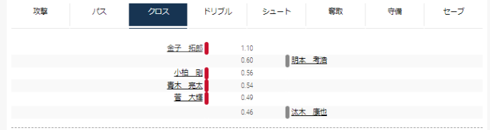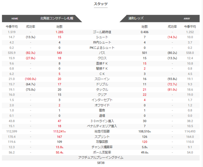 コンサドーレのスローイン成功率が100%、クロス成功率も高かった。意外なことに攻撃回数は浦和のほうが多かった。
