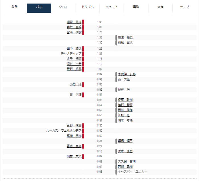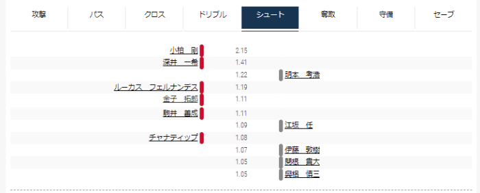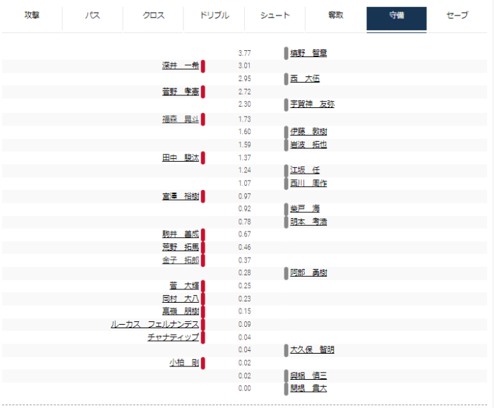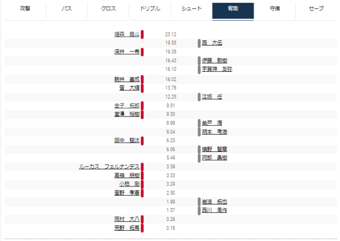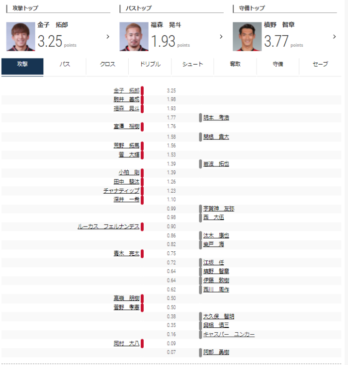 攻撃トップは金子、パストップは福森、守備トップは槙野だった。