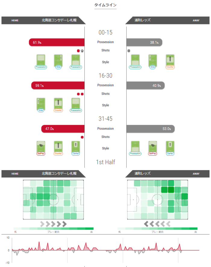 0-15分までで先制点をとったコンサドーレ。浦和にシュートを前半1本しかさせず。コンサドーレのプレー割合は中央と左サイドが多い。浦和は右サイドでのプレー割合が多い。