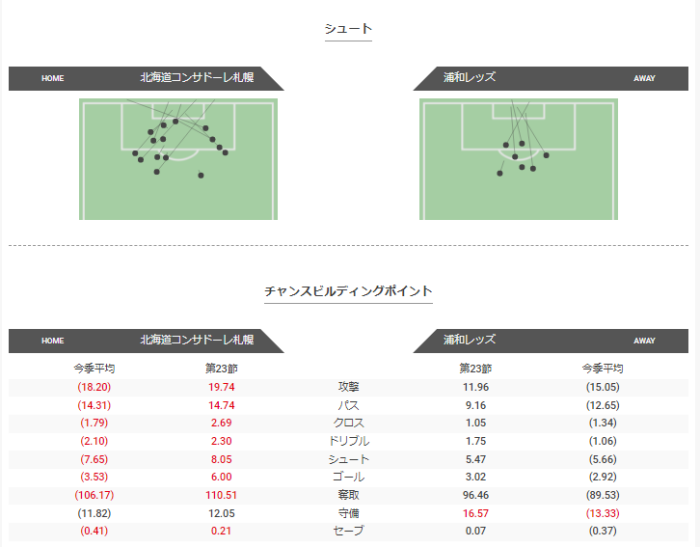 コンサドーレはミドルシュートが7本、ペナルティエリア内が8本だった。浦和のシュートはペナルティエリア内2本でゴールから遠いシュート、5本はミドルシュートだった。