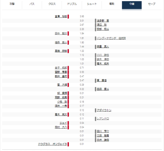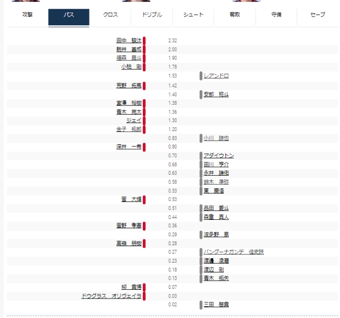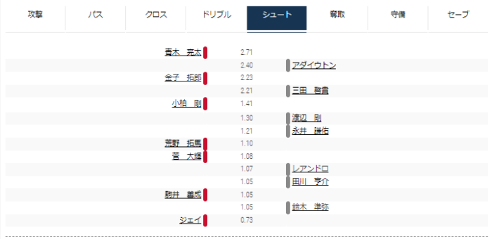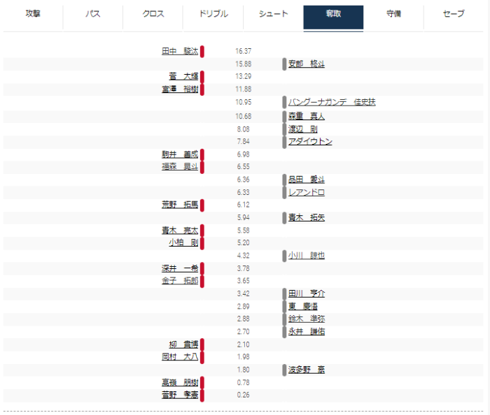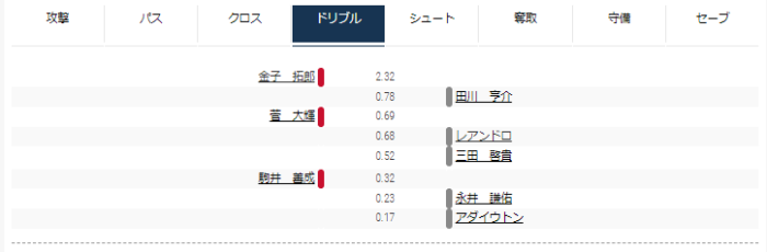 FC東京ではレアンドロと安部が上位に出てくることが多く、アダイウトンはドリブルで上位にいなかったのが意外だった。