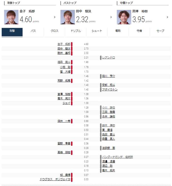 攻撃トップは金子、パストップは田中駿汰、守備トップは宮澤とコンサドーレの選手がトップを独占した。
