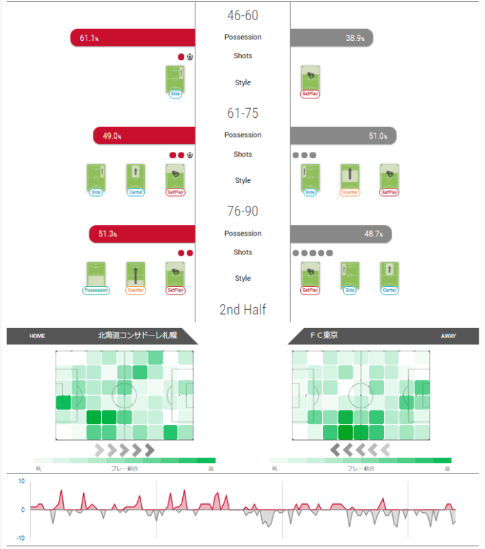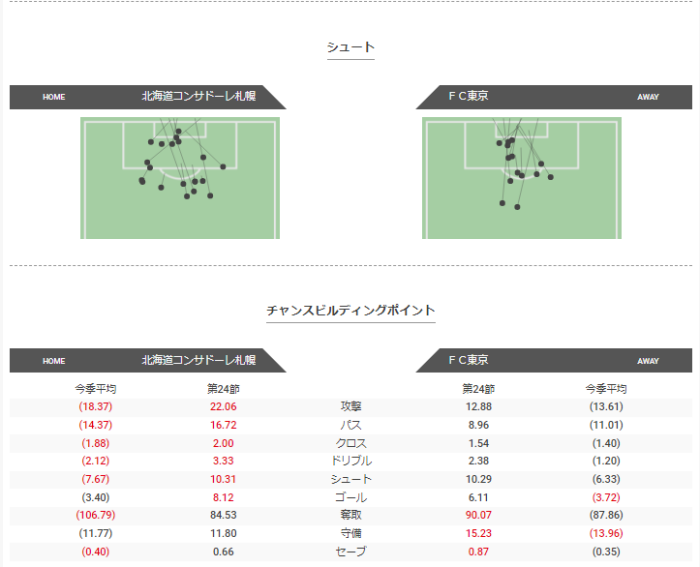 コンサドーレは平均と比較し、奪取以外で上回っていた。FC東京は平均と比較し、ドリブル、シュート、ゴールが大きく上回った。
