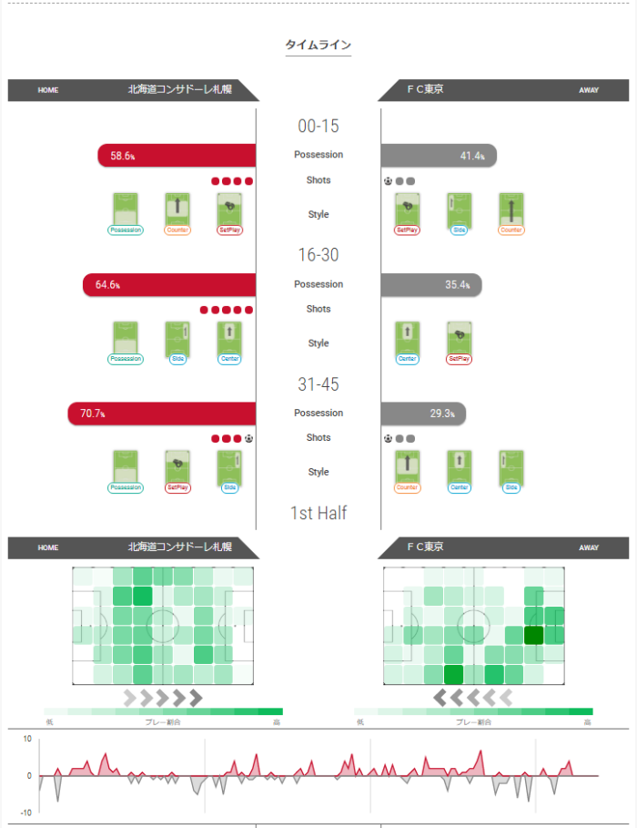 前半はコンサドーレのほうがおおくシュートを打てており、波を見てもチャンスが多いように見える。プレー割合ではFC東京の左サイドのプレーが多い。