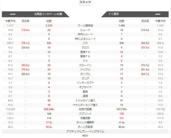 このデータではコンサドーレの枠内シュート率が25%と低い。コンサドーレのパス成功率が80%を切っており、低めになっているがFC東京のプレス強度の影響がありそうだ。アクチュアルプレーイングタイムが48分31秒と少ない印象。チャンス構築率はどちらも平均を超えており、得点が多かったことからもチャンスはどちらも多く作れていたようだ。