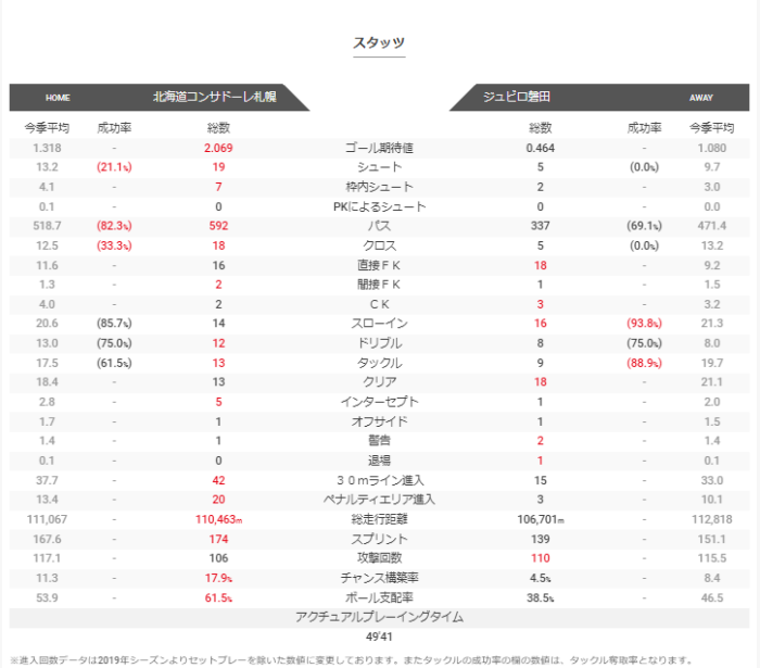 走行距離、スプリント回数では札幌がジュビロを上回っている。