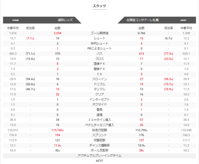 スタッツを見るとコンサドーレのほうが良い試合だったように見えるが、ゴール期待値では浦和のほうが上回っている。