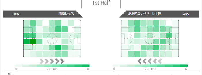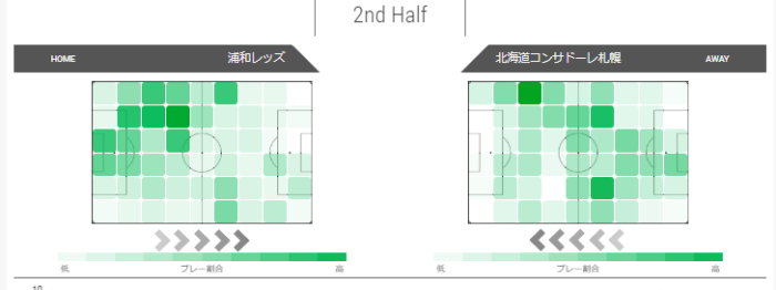 コンサドーレはピッチ全体でパスが見られ、左のハーフレーンへの進入が多く、右のハーフレーンへの進入さらにそこから左方向へのパスが見られる。浦和よりもペナルティエリア進入が多くみられる。