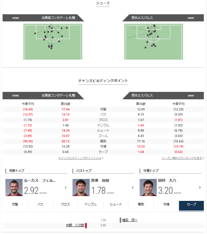 セーブでは今季平均を上回ったセーブをしている中野小次郎はこの試合でよいセーブをしていたようだ。
