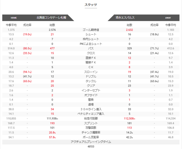 走行距離はほぼ同じ、スプリント回数ではコンサドーレが12回ほど多い。ゴール期待値でも一進一退にみえるが、エスパルスのほうが上回って終わったようだ。