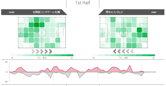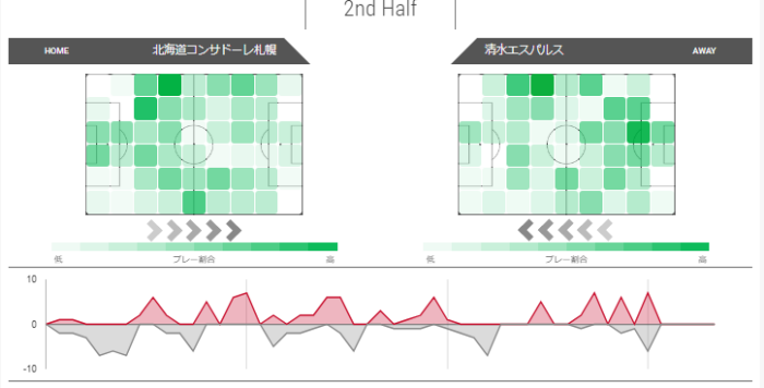 差が見れるところでいうとペナルティエリア進入。30 mライン進入は同じくらいだが、ペナルティエリア進入ではコンサドーレが15、エスパルスが5となっている。