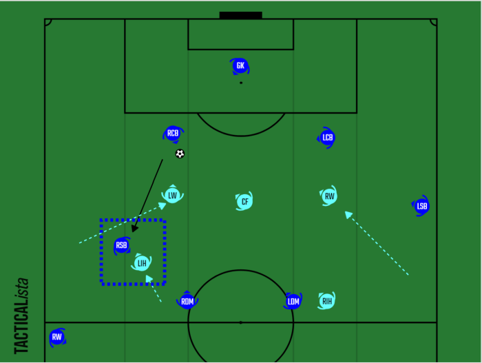 RSB松原が中央に入ってくる分、IHがプレスをかける際の距離は近づいてプレー選択に余裕がなくなる。