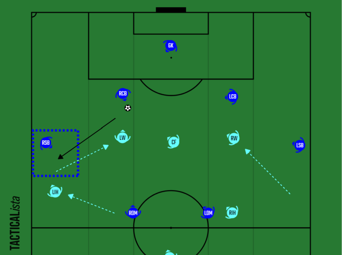 相手に外回りのポゼッションを強いてカウンターでの攻撃枚数を増やせるものの、IHの守備の負担が重すぎて相手SBに時間を与えてしまうのが難である。