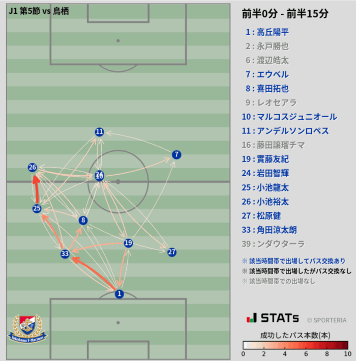 横浜FMは左ウイングで初スタメンとなった小池裕太を中心に序盤ペースを握る。