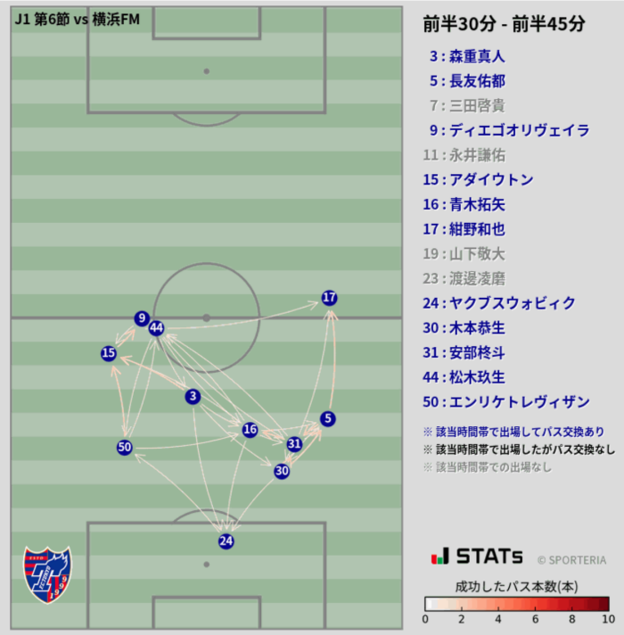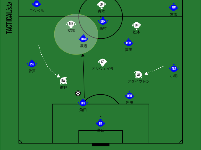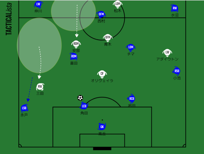 IHの強度・運動量が伴わないと第9節で対戦した川崎のように瓦解する恐れのあるプレスの方法だが、松木・安部の両IHによる献身的な守備によって成立していた。