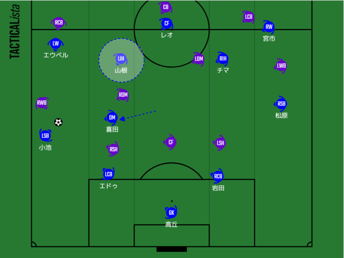 IHながら積極的にSBの横まで下がってくることによりサポートを作り、プレスを回避する局面において積極的に自分達の形を作りに行っていた。