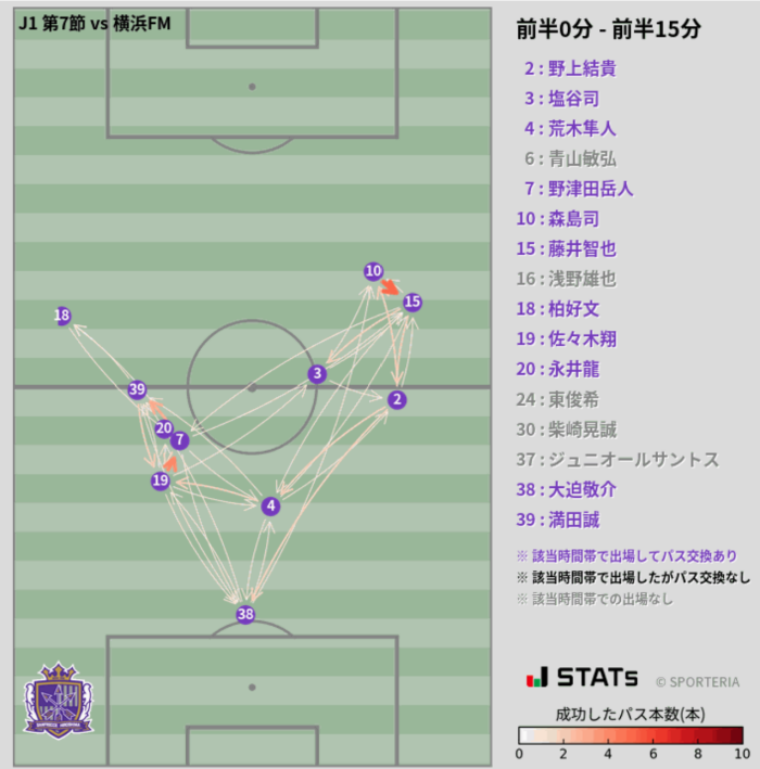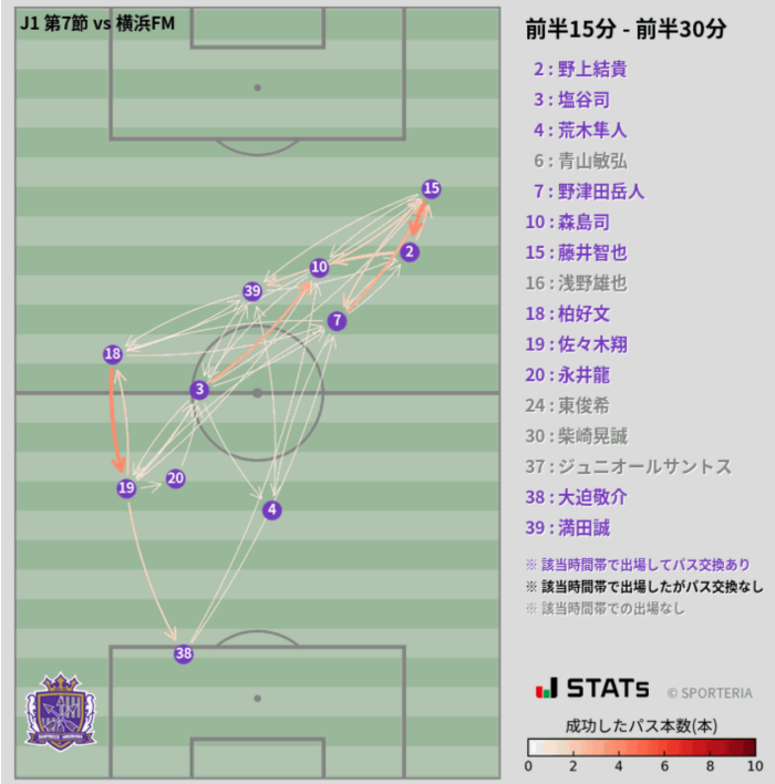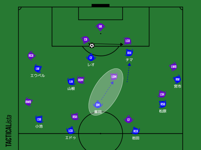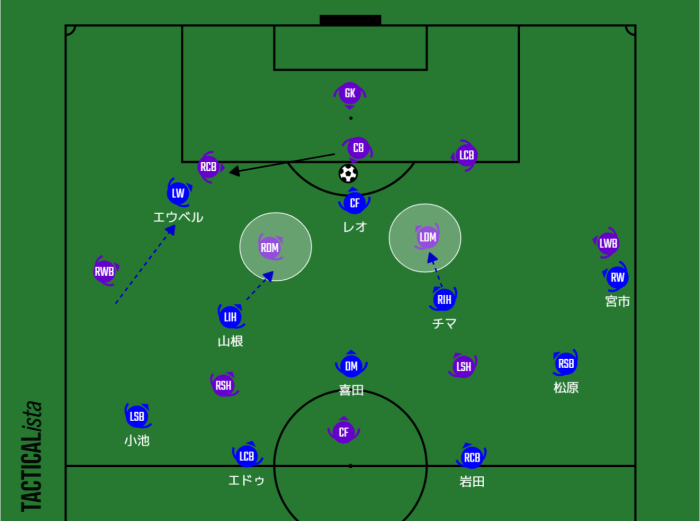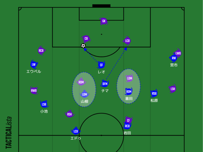 慣れない1アンカー+2IH(インサイドハーフ)の形による中盤の立ち回りが整理されず、攻守両面で広島に圧倒される結果となった。