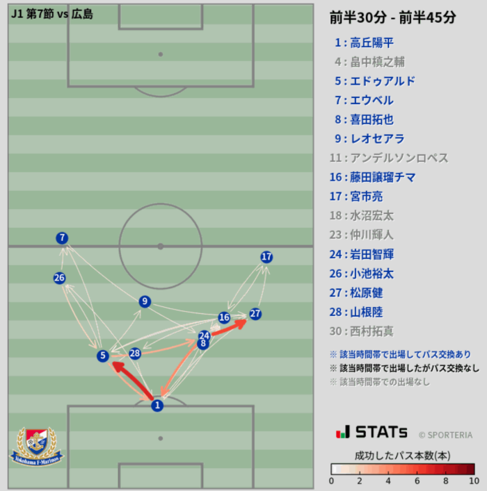 その明確なキッカケは分からなかったが、個人的には広島の中盤の選手達が横浜FMの楔のパスに順応してきたのかなと感じた。