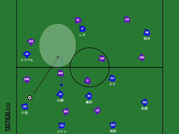 横浜FMの弱点はSB裏を狙われてカウンターを食らうことだが、ボールを奪われた瞬間に1stDFが素早くプレスをかけることでSB裏をカバーする時間を作り、RWB藤井の単発攻撃だけに抑えて込んでいた。