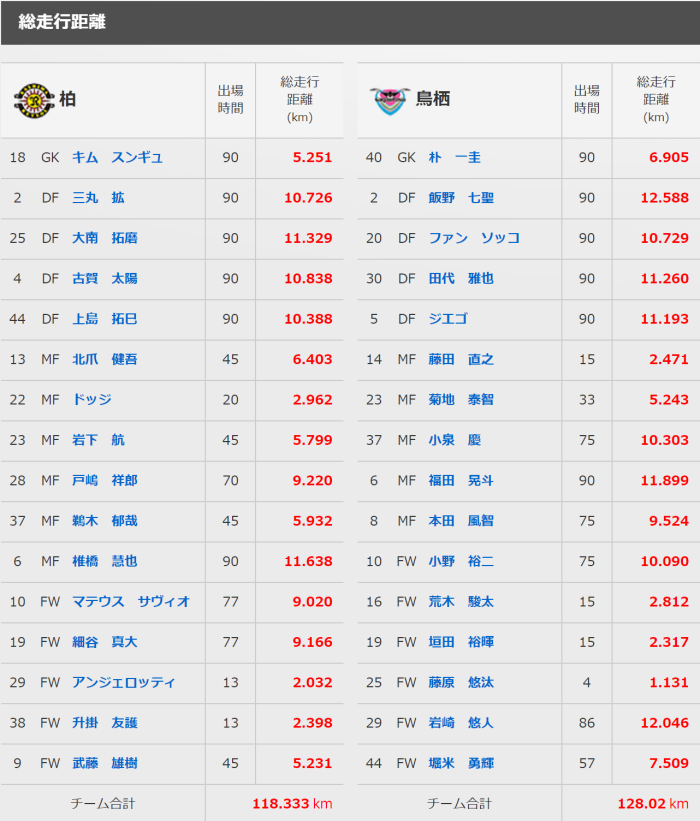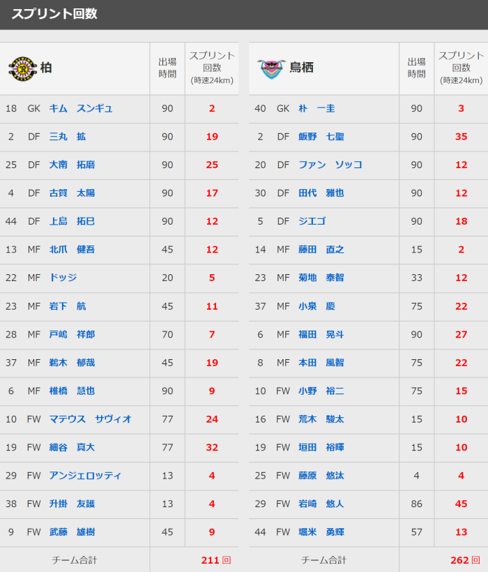 柏相手に走行距離で10km、スプリント回数で50回近い差を付ける鳥栖はさすがですね👏😲