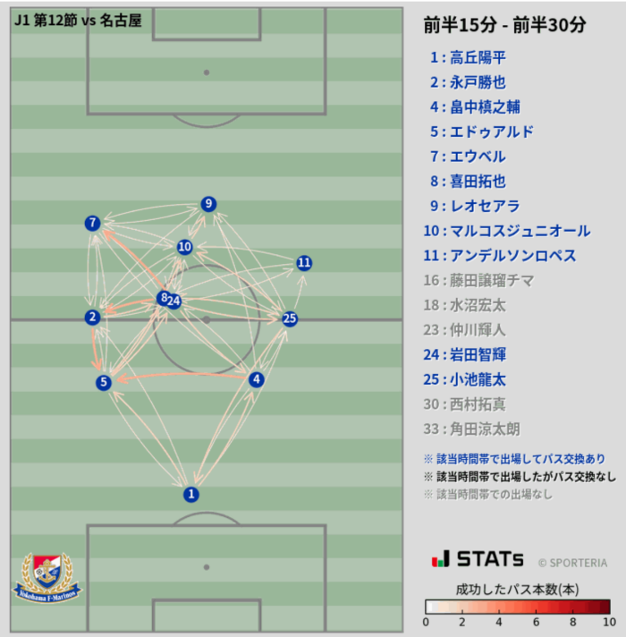 トップながらサイドで絶妙なポジションをとるので、横浜FMは左WGと左SBのどちらがマークを見るのか曖昧になるシーンが多々見られた。