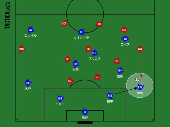 吉田の猛烈なスプリント・プレスで押さえ込まれていた右SBの小池が余裕を持ってボールを受ける&捌けるようになる。