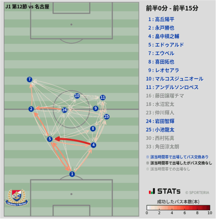 序盤の横浜FMは名古屋のハイプレスに苦しみ、なかなか最終ラインから前進することが出来ずにいた。